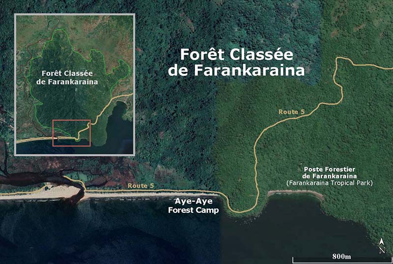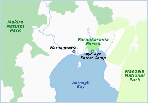 The Aye-Aye Forest Camp is located on Antongil Bay at the edge of the 2,770 ha Forêt Classée de Farankaraina (Farankaraina Classified Forest). It is an ideal launch point for visiting the Antongil Bay area as it is easily accessible (less than an hour) by boat from Maroantsetra, and access is not subject to bad weather which can entail a rough or possibly dangerous ocean crossing.